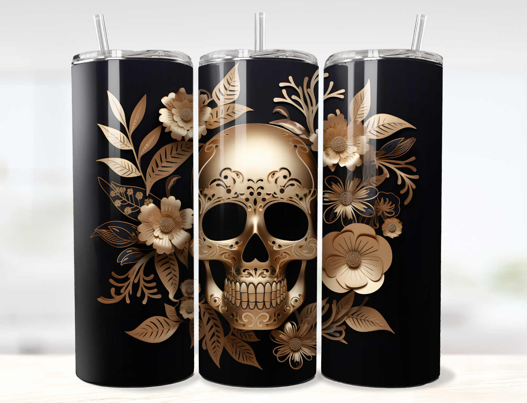 3D Gold Skull with Flowers Tumbler Wrap PNG