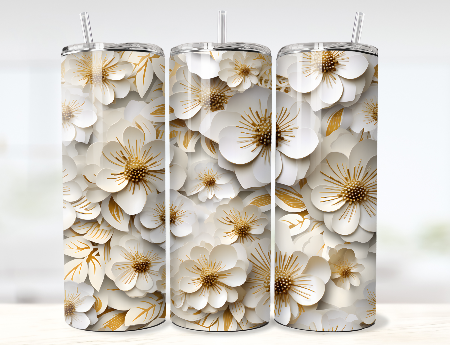3D Paper Flowers White and Gold Tumbler Wrap PNG