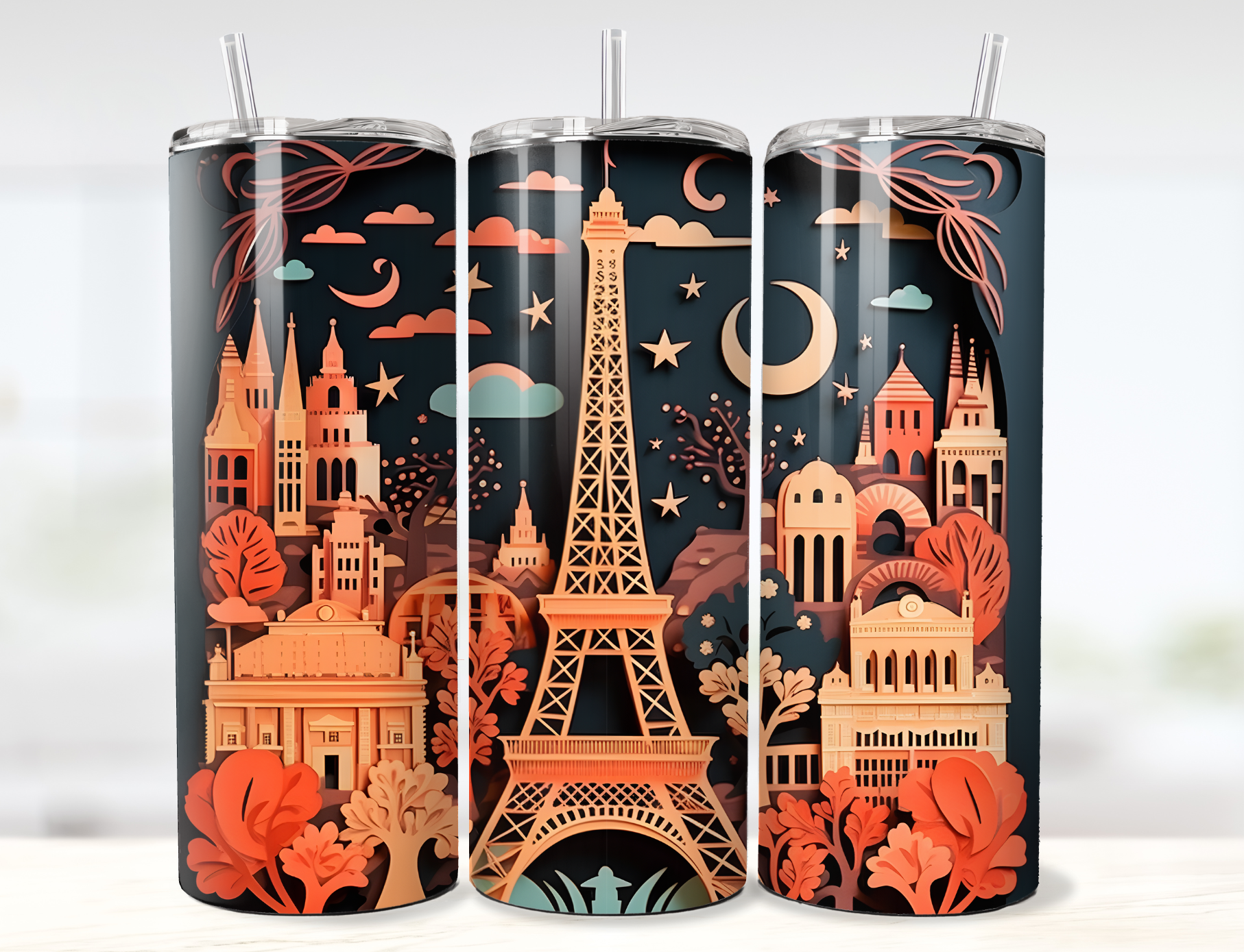 3D Paper Paris Eiffel Tower in Autumn Tumbler Wrap PNG