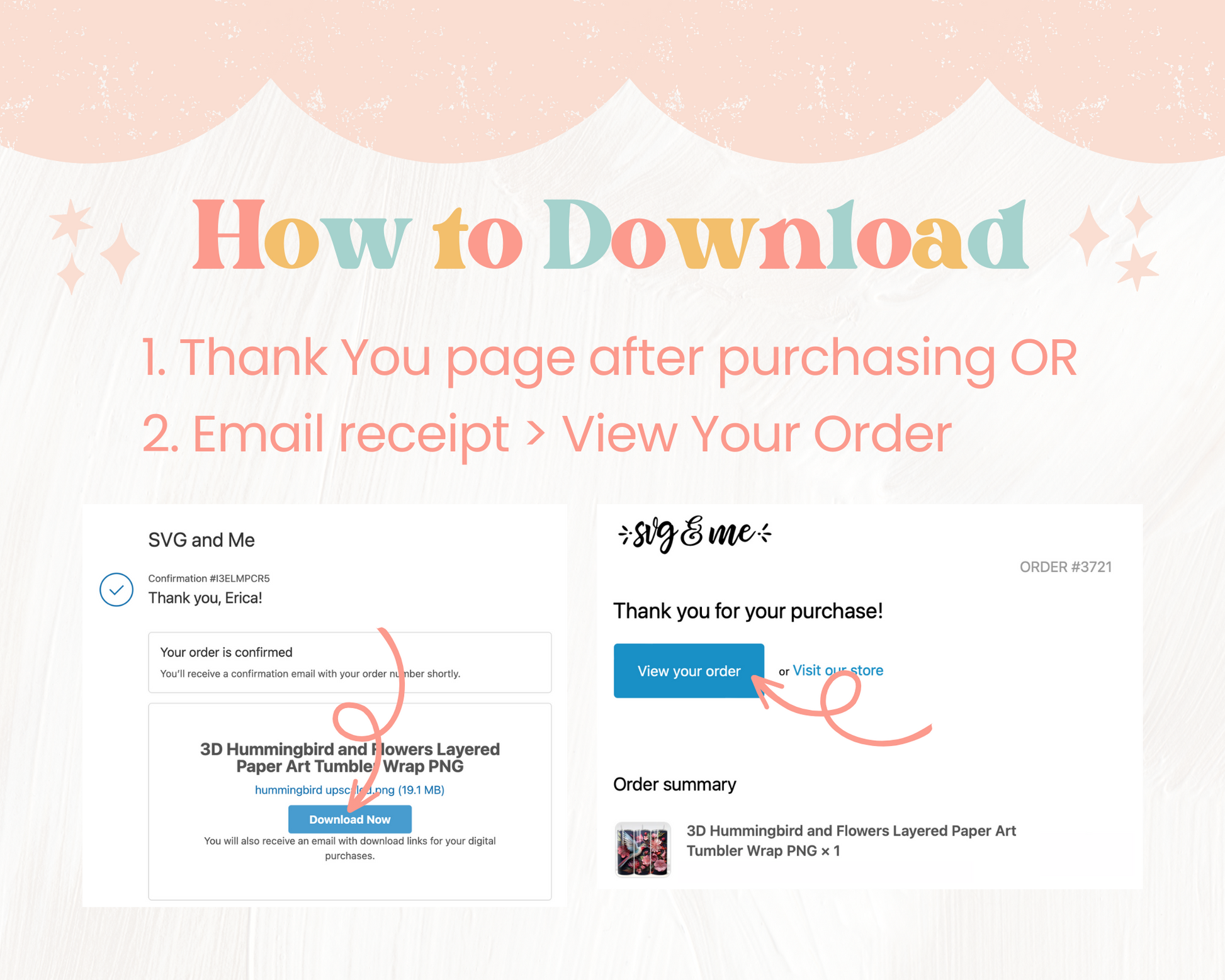 - Download instantly after purchasing on the “Thank You” page OR on your email receipt > blue “View Your Order” button > download page